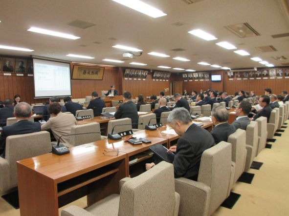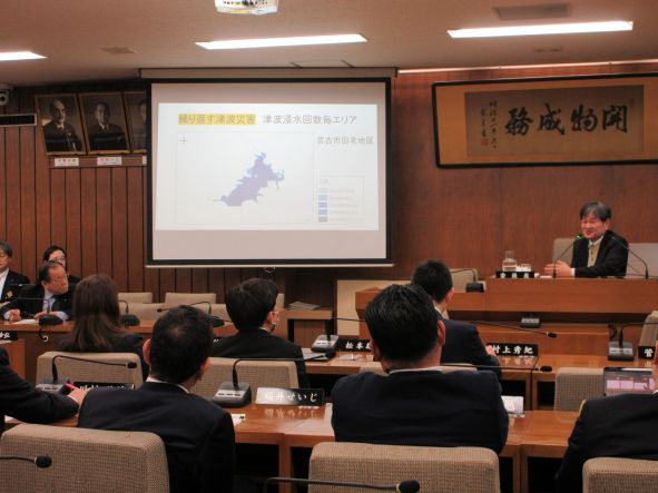 岩手大学理工学部教授の南正昭氏を招き、「災害復興とこれからのまちづくり」について説明を受けた後、質疑、意見交換を行いました。 委員からは、今後、発生が想定される災害への備えや、復興の取組におけるスピードと地元の合意形成との兼ね合い、人口減の状況下にあって、今後の復興の取組において重視すべき点等について質問があり、質疑が交わされました。